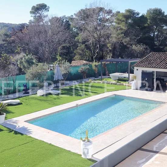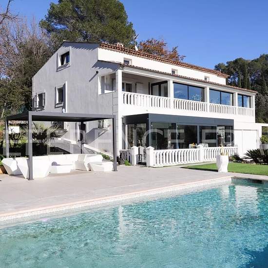 Votre référent immobilier local de Mougins (Sébastien MENAND) vous propose. Dans un quartier calme de Mougins et proche de toutes les commodités à pieds. Vue sur le vieux village. Villa rénovée développant 350 m² habitables approx (450 m² au total incluant garage et combles aménagés). Séjour, salle à manger cuisine. 5 chambres. Salle de cinéma. Salle de sport. Garage double avec porte vitrée pour voir les voitures de l'intérieur. Climatisation réversible. Piscine de 5 par 10. Pool house...........................................................