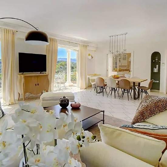 Villa tres spacieuse en position dominante - location a l'annee a partir de septembre 2025- très jolie propriété à mougins, située au cœur d'un domaine privé près d'un golf, en position dominante, très calme et sans vis-à-vis. Cette jolie villa provençale moderne d'une surface de 350 m2 sur un terrain de 2000 m2 est composée : au premier étage : une belle entree avec toilettes pour invites, un séjour/salle à manger très spacieux avec 2 terrasses, une grande cuisine, toute équipée avec coin repas, une buanderie, 3 chambres en suites avec sall...