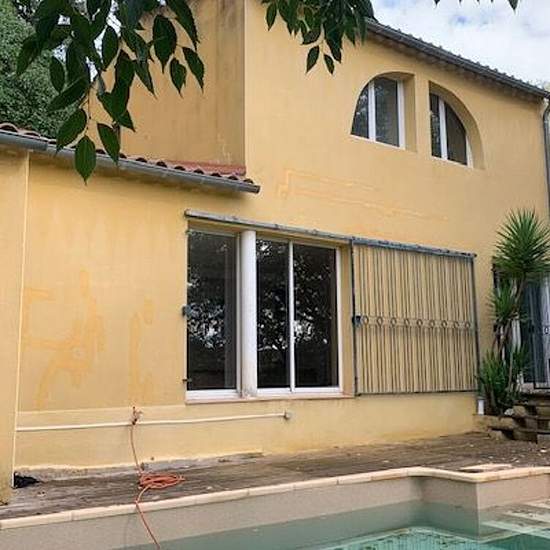 Maison À Louer. Nîmes, Chemin de l'Alouette, villa de 175m² en R+1 comprenant au rdc, une pièce à vivre, une cuisine aménagée, 3 chambres dont une avec salle d'eau et wc, une salle de bain, wc indépendant, une buanderie. A l'étage un grand dégagement, une salle d'eau avec wc, 2 chambres. Jardin avec pisicne. Loyer 1500€ c.c (entretient piscine)