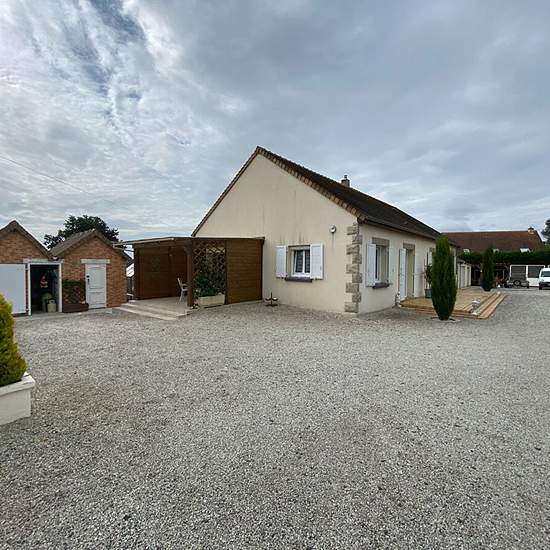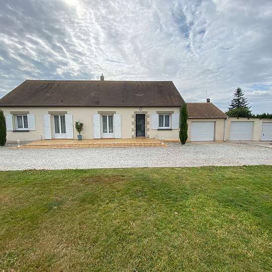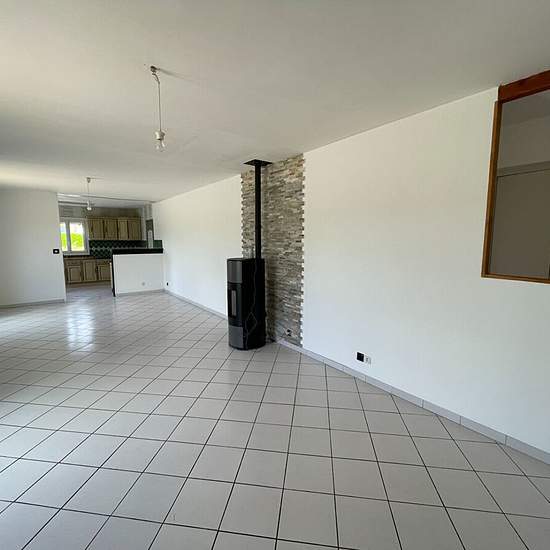 UNIQUEMENT CHEZ HUGUES IMMOBILIER A louer, pavillon de plain pied comprenant : entrée, ar-cuisine, cuisine aménagée équipée ouverte sur séjour-salon avec poêle à granulés, salle de bains, wc et 4 chambres. Triple garages accolés avec portes électriques, hangar, chenil, caves, atelier, abris de jardin .....d'une surface totale d'environ 130m2. Terrasses, terrain clos d'environ 2000m2. Libre le 15 février 2026.
