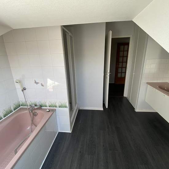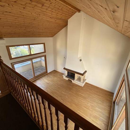CHAMBERY - Proche hôpital - T7 duplex à louer de 189,56m² au 6ème et dernier étage avec ascenseur comprenant 2 niveaux. Au 1er niveau : Cuisine équipée (four, plaque électrique, hotte, lave-vaisselle), séjour avec cheminée, 2 terrasses, 2 chambres, bureau, salle de bains, WC, débarras. Au 2nd niveau : 3 chambres, salle de bains, WC, grenier. Cave et garage double. Disponible le 25/01/2026. Loyer : 1200 euros + 586 euros de charges (copropriété, entretien clim, chauffage, eau chaude, eau froide et TOM inclus). Honoraires : 892 euros.