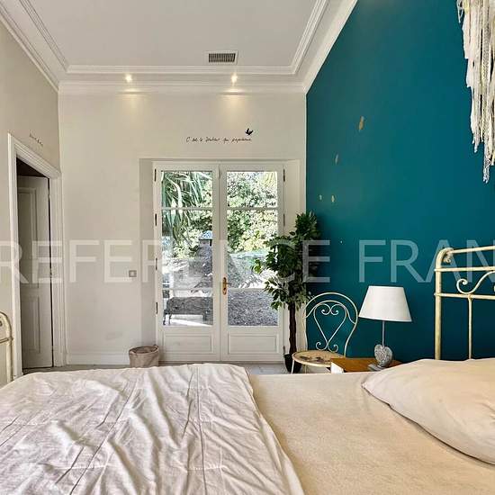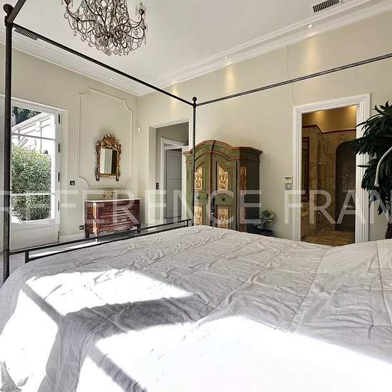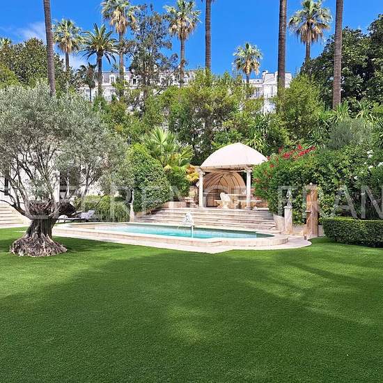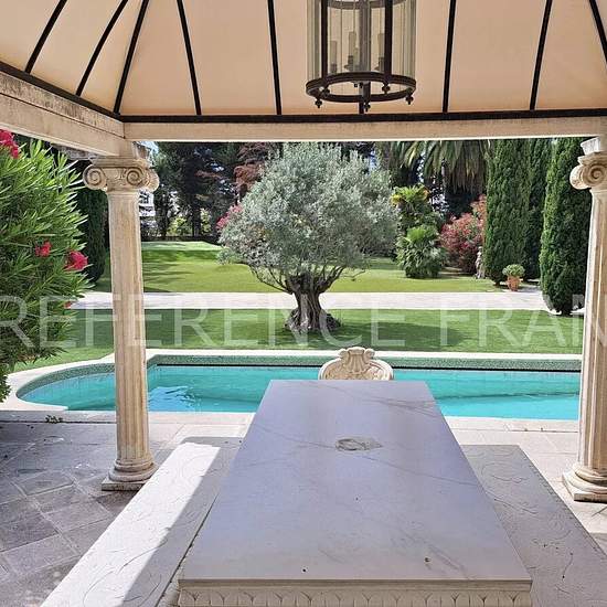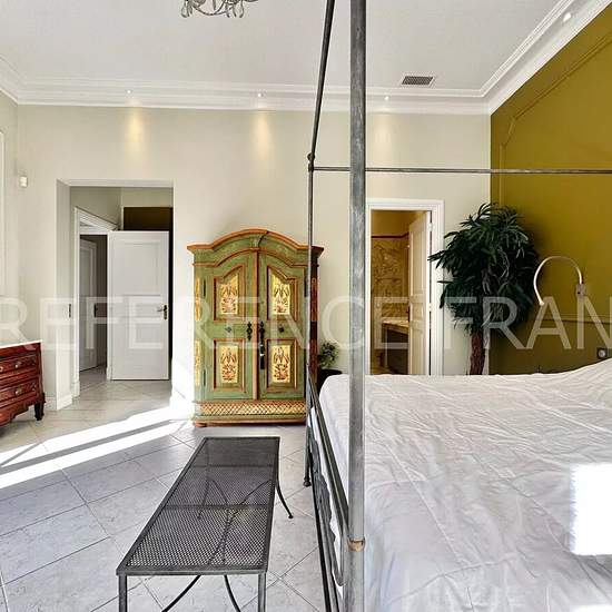 Située à pied des plages du centre-ville de Cannes. Magnifique propriété d’architecture vénitienne aux prestations modernes d'une surface de 345 m2 édifiée sur de 4 500 m2 de terrain paysager avec piscine, pool-house, barbecue et MiniGolf. Entièrement climatisée et distribuée sur deux niveaux, elle se compose ainsi : EN REZ DE JARDIN : - Entrée - Séjour/salon TV avec billard et cheminée au bois - Cuisine US entièrement équipée avec salle à manger - Chambre 1 : Suite avec penderie, salle de bain, toilette et accès jardin - Chambre 2 : Suite a...