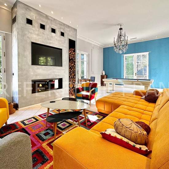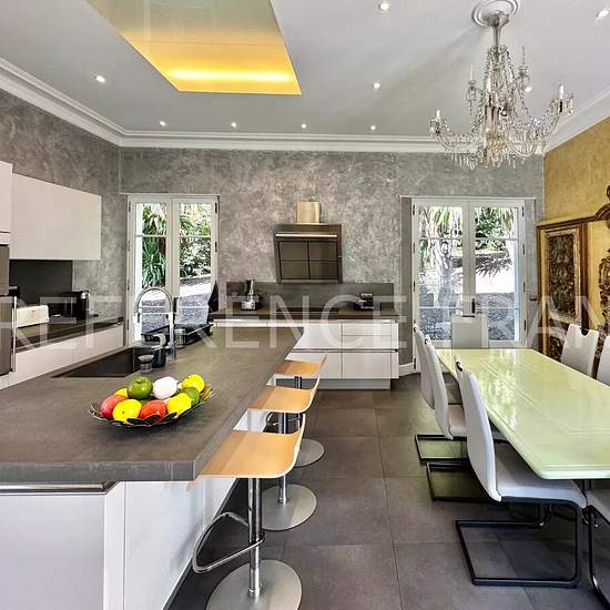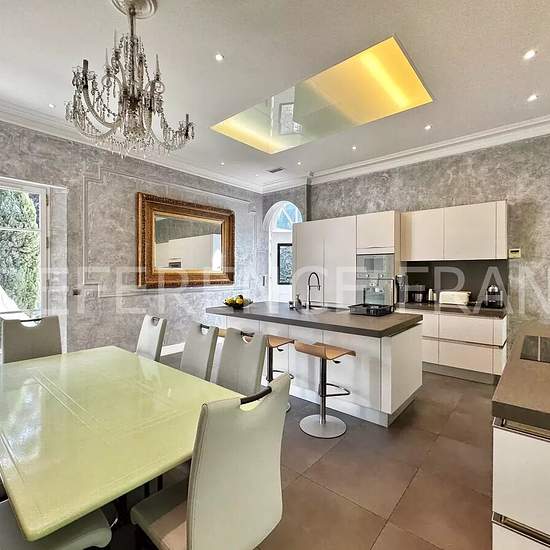 Située à pied des plages du centre-ville de Cannes. Magnifique propriété d’architecture vénitienne aux prestations modernes d'une surface de 345 m2 édifiée sur de 4 500 m2 de terrain paysager avec piscine, pool-house, barbecue et MiniGolf. Entièrement climatisée et distribuée sur deux niveaux, elle se compose ainsi : EN REZ DE JARDIN : - Entrée - Séjour/salon TV avec billard et cheminée au bois - Cuisine US entièrement équipée avec salle à manger - Chambre 1 : Suite avec penderie, salle de bain, toilette et accès jardin - Chambre 2 : Suite a...