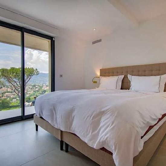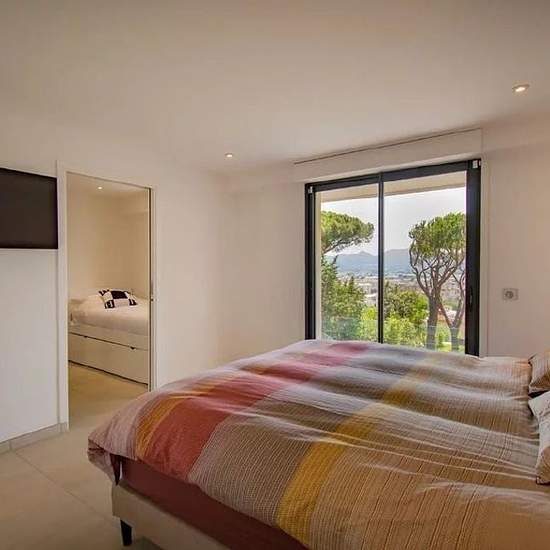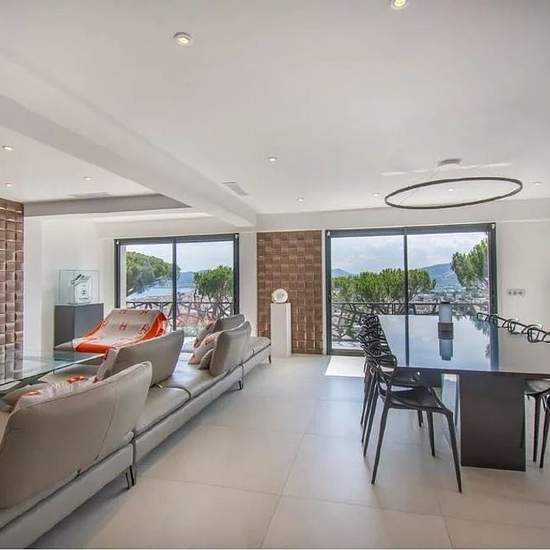 LOCATION A L'ANNEE A PARTIR DE DEBUT MARS 2025 - Villa moderne de 315m², 5 chambres, 5 salles de bain, salle de sport, piscine, vue mer, sur un large terrain arboré de 2800m². Rez de chaussée : Hall d’entrée avec toilettes pour les invités, Double salon / salle à manger ouvert sur la terrasse et vue mer : large canapé 10 places, télévision, table repas pour 10 personnes. Cuisine moderne ouverte entièrement équipée : réfrigérateur américain, plaque induction, four, micro-onde, cave à vin, lave-vaisselle, machine à café, îlot central avec tabl...