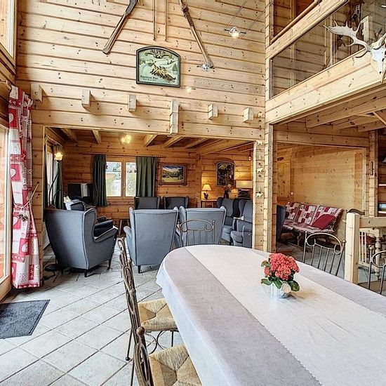 Situé entre Combloux et Megève, à 800m des pistes de la Princesse, grand chalet confortable d’environ 250 m2, composé de : Au sous-sol : 2 garages, ski room, buanderie avec LL, SL et Congélateur, d’une petite chambre avec lits superposés (90) et un lit simple (90), SDD. Au 1er niveau : Une entrée avec WC, cuisine équipée indépendante avec LV, plaque induction, frigo, four. Un grand séjour avec coin salon et salle à manger, une chambre 2 personnes (lit 140) avec SDD et WC. Au 2ème niveau : Une chambre 2 personnes (lit 140) avec balcon et SDB ...