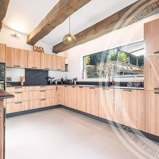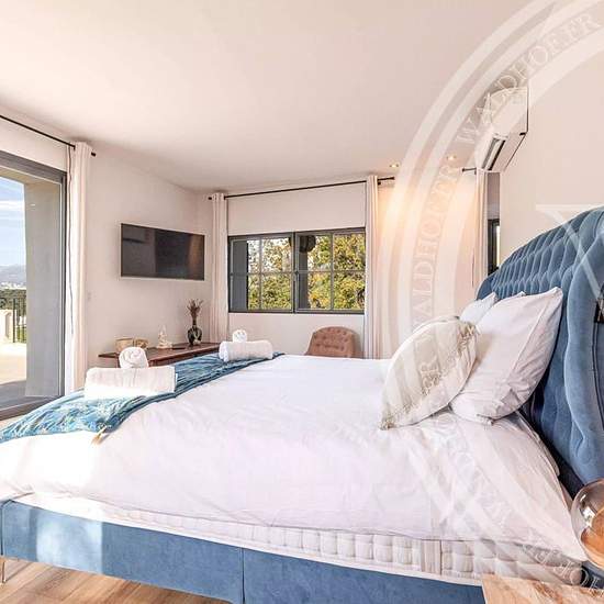 Superficie Habitable: 250 mètres carrés. 1 salon - salle à manger - cuisine fermé. 1 pool house à proximité de la piscine. 5 chambres en suites. 5 salles de Bain. 1 appartement indépendant. 1 piscine. - Au Rez-de-chaussée : une entrée, une buanderie, une chambre en suite avec salle de bain et douche, un WC invité, une salle à manger, une cuisine équipée, un salon vue panoramique sur le golf. - Au 1er étage : une salle de douche, WC, une chambre de maître avec accès grande terrasse vue sur le golf. - Au rez-de-jardin : une chambre (lit 160 cm...