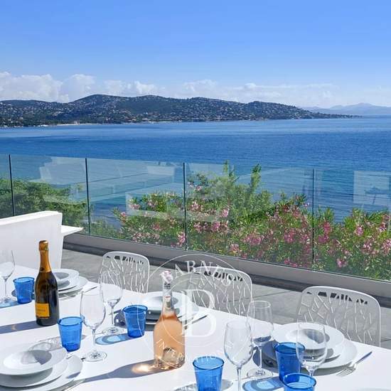 * Villa La Pointe * Située dans un environnement calme à Sainte-Maxime, villa de 330 m² offrant une vue mer panoramique sur le Golfe de Saint-Tropez. La propriété se compose d'un salon ouvert sur une salle à manger, d'une cuisine équipée ainsi que de quatre chambres avec salles de douches. Une première dépendance composée d'un studio avec canapé convertible, une kitchenette, un espace TV / Jeux ainsi qu'une salle de douches. Une seconde dépendance avec une cuisine équipée ainsi qu'une chambre avec salle de bains. Équipements: Climatisation d...