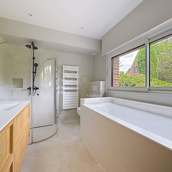Idéalement située au coeur du prestigieux Golf de Bondues, cette demeure d'exception de 320 m² séduit par ses prestations, ses volumes généreux et sa vue imprenable sur le parcours. Dès l'entrée, un vaste séjour avec cheminée insert vous accueille dans une atmosphère lumineuse et conviviale, avec de grandes ouvertures. Un grand bureau avec vue sur le golf complète cet espace de vie . La suite parentale en rez-de-chaussée est exceptionnelle : chambre avec terrasse privative, dressing, salle de bains spacieuse (baignoire, douche, double vasque...