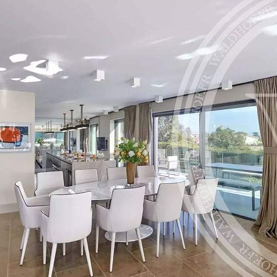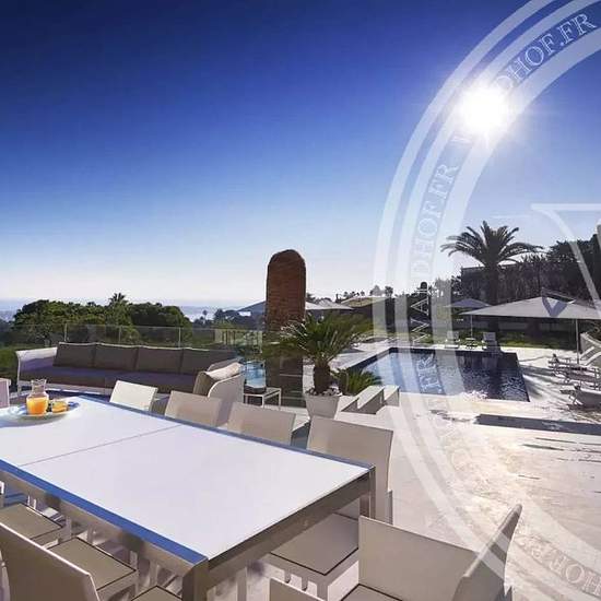 Cette villa, vue panoramique & mer, bénéficie d'une belle position dominante, dans le quartier résidentiel de Super Cannes, à 10 minutes du centre animé de Cannes, des plages de sable de La Croisette & 15 min du Palais des Festivals. Dans une propriété, sécurisée de 1,600 m2, la maison de 330m2, villa contemporaine, sur 2 niveaux, offre, dans aménagement moderne, un intérieur contemporain, 6 chambres en-suite, 1 chambre & 1 studio dédiées au personnel. au niveau d'entrée (RDC) : - 1 Suite parentale double équipée d'un lit King Size(180x200cm...