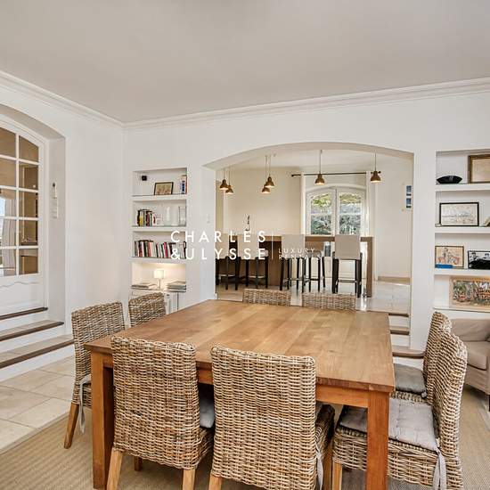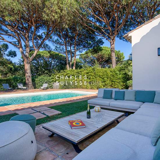 A proximité du village de Saint-Tropez et de la plage de la Bouillabaisse, cette villa provençale comprend une villa principale avec de belles pièces à vivre, 3 chambres avec salle de bains ainsi qu'une annexe de 2 chambres / 2 salles de douche. Dans la maison principale, la chambre de maître bénéficie d'une terrasse tropézienne vue mer. Une annexe indépendante comprenant 2 autres chambres avec salle de bains ainsi qu'une chambre de personnel avec sa salle de douche. A l’extérieur, une grande piscine cernée de pins parasols, jardi...