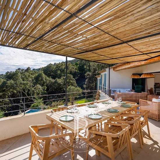 Cette villa récemment rénovée d'environ 300m², se situe sur les hauteurs de La Croix-Valmer et offre une vue sur la mer. Au rez-de-chaussée, la villa se compose d'une cuisine ouverte sur le salon et la salle à manger, de deux chambres en suite. Un espace bureau/bibliothèque ainsi qu'une chambre en suite avec une terrasse tropézienne complètent le premier niveau. Au rez-de-jardin, se trouvent une suite parentale, deux chambres en suite et un salon TV. Le jardin, joliment arboré, dispose de plusieurs terrasses, d'une piscine ainsi que d'un ter...