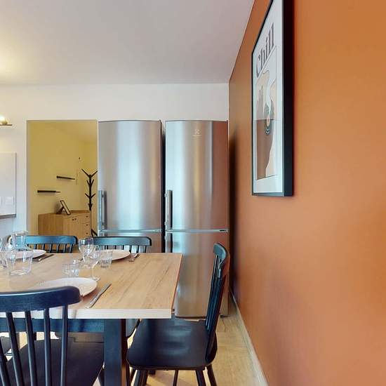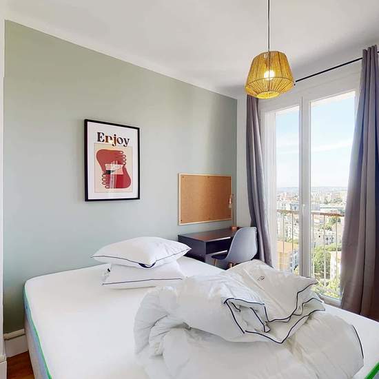 This spacious and comfortable room has been designed for you dear roomie! Practical and functional, the room is equipped with high quality bedding (140x200cm), a beautiful wardrobe, a night table and a true office space for your exams or your home office days! All of this in a cheerful and warm atmosphere. In addition, you have access to a shared bathroom and a shared balcony. Beautiful flatshare in Bezons ! Discover Bezons Luther King, our cosy and freshly renovated contemporary-style apartment. Close to local shops and restaurants, it is e...