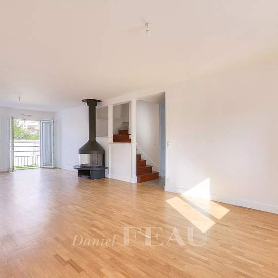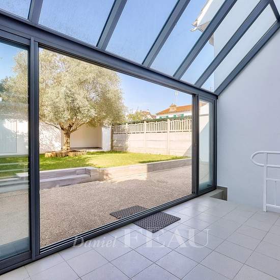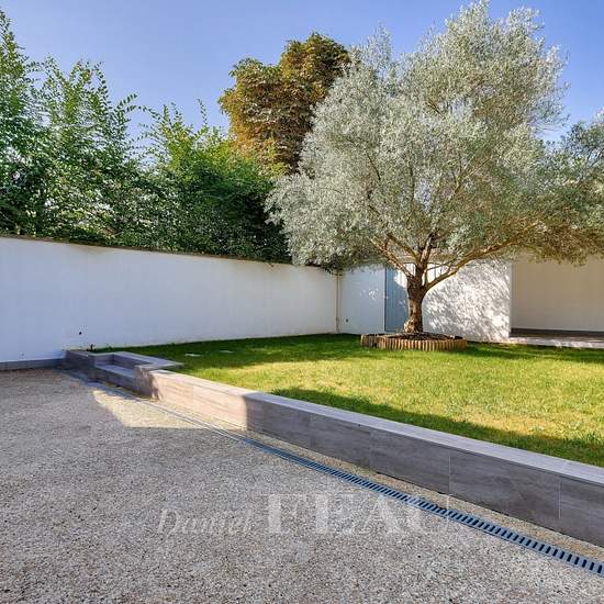 Située dans le quartier du plateau Mont Valérien, dans une rue calme, jolie maison avec jardin de 177m2 habitables et 322m2 de superficie totale. Au rez-de-chaussée, elle se compose d'une entrée avec placards, d'un beau double séjour traversant, équipé d'un poêle à bois, et surplombant le jardin, d'une salle à manger attenante à la cuisine aménagée et de toilettes invités. En descendant quelques marches, une véranda de 10m2 ouvre sur la terrasse de 28m2 et le jardin, exposés sud-ouest et sans vis-à-vis. Un abri de jardin et une remise en par...