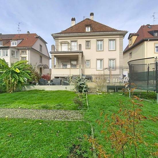 STRASBOURG - Maison de maître de style néo-classique de 1930 - rue des capucins - Sur un terrain de 6.37 ares, une maison de 299.05m² (x4 plateaux de 126m²) comprenant : Au rez-de-chaussée : une grande entrée avec un dégagement desservant : un séjour, une salle à manger, une cuisine indépendante aménagée et équipée donnant accès à une terrasse, une chambre, et une salle d'eau avec wc. Au 1er étage : 4 grandes chambres dont 1 avec un accès à un balcon, une salle de bains et un wc séparé. Au 2ème étage : entièrement rénové, 2 pièces dont 1 cha...