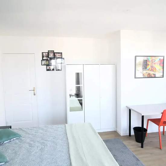 Room of 13m², fully furnished. It has a double bed (140x190) and a bedside table with lamp. A working area is included, composed of a desk with chair and lamp. The room also has storage space, a wardrobe with hanging space and a shelf. The room also has an armchair but its main feature is its access to the balcony. Located at the gates of Paris, this 90m² apartment benefits from an ideal location, close to the Parc Roger Salengro and the metro station: Saint Ouen and close to all amenities. The apartment is located on the 5th floor of a secu...