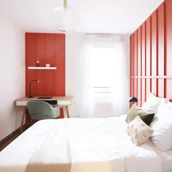 Welcome to Lille! Discover this 12 m² bedroom for rent in a very nice 100 m² duplex. Chic and contemporary, this fully equipped bedroom is just a few minutes from public transportation and amenities (supermarkets, gyms). This beautiful bedroom, with embossed walls punctuated with burgundy color, has a sleeping area and a working area where you can work and study in the best environment. Both are furnished. With the coliving, you will not have to worry about the additional costs associated with your coliving bedroom. Home insurance and intern...