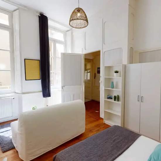 This lovely private bedroom in a fully equipped, furnished and all-inclusive flatshare in Lyon is a mix of comfort and design. It has got household furnishings, including a bed with pillows and duvet What is missing is your things to feel at home! The room can be locked if you need intimacy. The flatshare can be found in the Hôtel de Ville - Presqu'île neighborhood, in the heart of Lyon. Plenty of shops, public transports, restaurants are accessible close by. The apartment is on floor 2 with lift. It is entirely equipped and is composed of a...