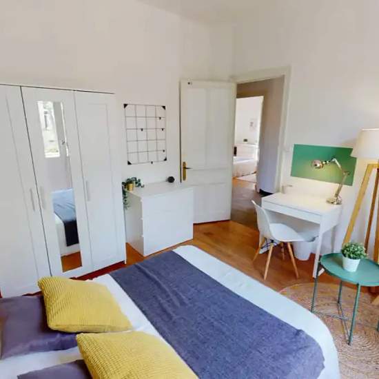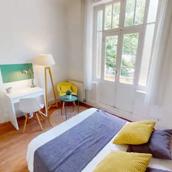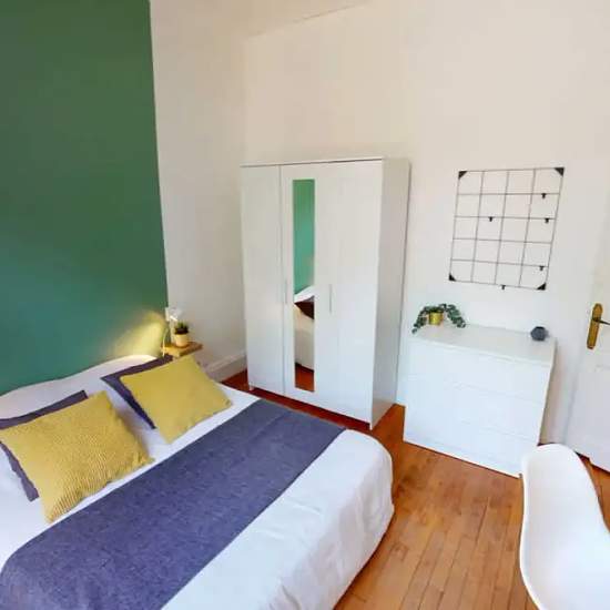 This lovely private bedroom in a fully equipped, furnished and all-inclusive flatshare in Lyon is a mix of comfort and design. It has got household furnishings, including a bed with pillows and duvet What is missing is your things to feel at home! The room can be locked if you need intimacy. The flatshare can be found in the Monchat neighborhood, in the heart of Lyon. Plenty of shops, public transports, restaurants are accessible close by. The apartment is on floor 0 without lift. It is entirely equipped and is composed of a large kitchen wi...