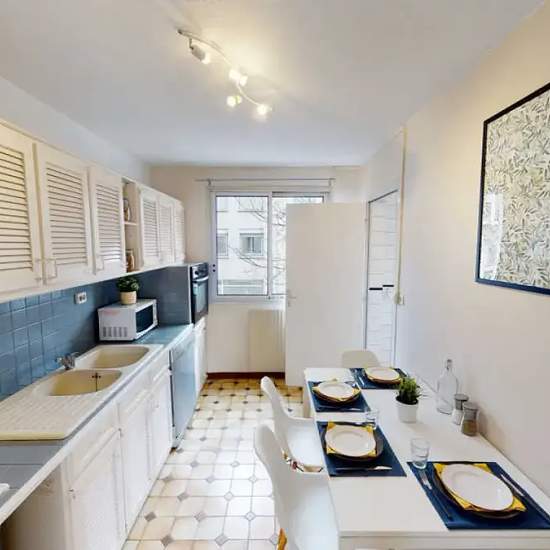 This lovely private bedroom in a fully equipped, furnished and all-inclusive flatshare in Lyon is a mix of comfort and design. It has got household furnishings, including a bed with pillows and duvet What is missing is your things to feel at home! The room can be locked if you need intimacy. The flatshare can be found in the Debourg - Gerland neighborhood, in the heart of Lyon. Plenty of shops, public transports, restaurants are accessible close by. The apartment is on floor 1 with lift. It is entirely equipped and is composed of a large kit...