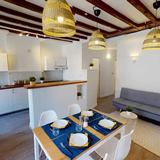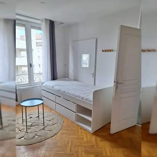 This lovely private bedroom in a fully equipped, furnished and all-inclusive flatshare in Lyon is a mix of comfort and design. It has got household furnishings, including a bed with pillows and duvet What is missing is your things to feel at home! The room can be locked if you need intimacy. The flatshare can be found in the Manufacture neighborhood, in the heart of Lyon. Plenty of shops, public transports, restaurants are accessible close by. The apartment is on floor 3 without lift. It is entirely equipped and is composed of a large kitche...