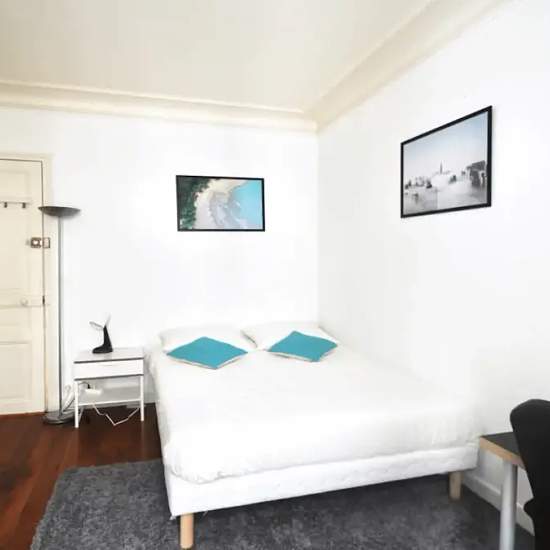 Room of 13m², fully furnished. It has a double bed (140x190) accompanied by a bedside table with lamp and a large mirror at the head of the bed. A work area is included, composed of a desk with chair and lamp. The room also has a number of storage units: two wardrobes with hanging space and a shelf. The room has a sitting area with an armchair and coffee table. Located in the 16th arrondissement of Paris, in the Exelmans district, this 76m² flat benefits from an ideal location, near the Parc des Princes and all amenities. The flat is on the ...