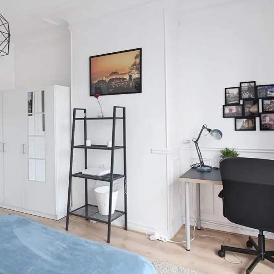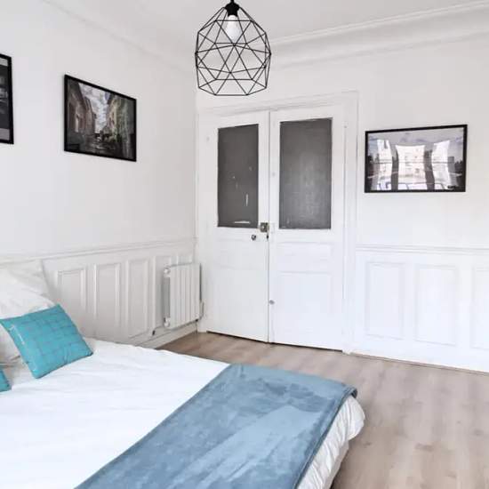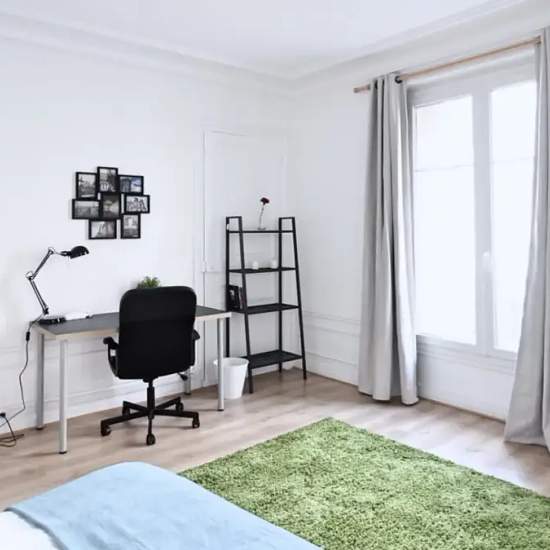 Large room of 16m², fully furnished. It has a double bed (140x190) and a bedside table with lamp. A working area is included, composed of a desk with chair and lamp. The room also has storage space: a wardrobe with hanging space and a shelf. Located in the 18th arrondissement of Paris, in the Goutte d'or district, this 62m² apartment benefits from an ideal location, a stone's throw from the Sacré-Coeur and near all amenities. This apartment is located in a secure building with digicodes and an elevator. The apartment has 3 bedrooms, a kitche...