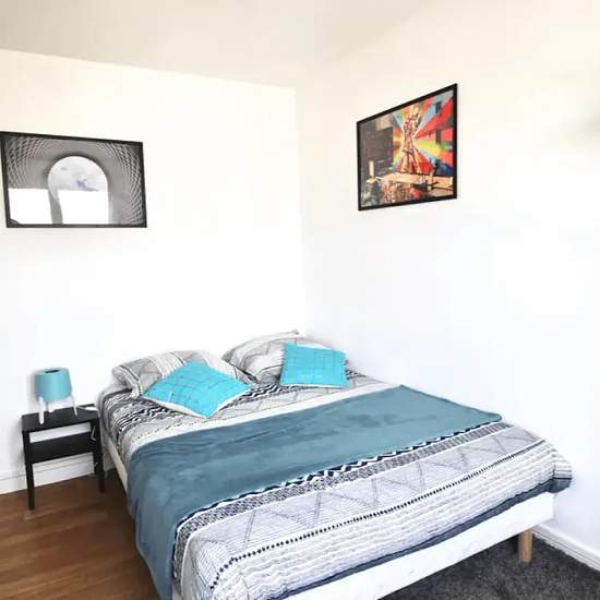 Room of 11m², fully furnished. It has a double bed (140x190) accompanied by a bedside table with lamp and a large mirror at the head of the bed. A work area is included, composed of a desk with chair and lamp. The room also offers several storage spaces: a wardrobe with hanging space and a shelf. The main feature of this room is the view of the capital. Located in the 20th arrondissement of Paris, in the Saint Blaise district, this 80m² apartment benefits from an ideal location, a stone's throw from the Père Lachaise Cemetery and close to al...