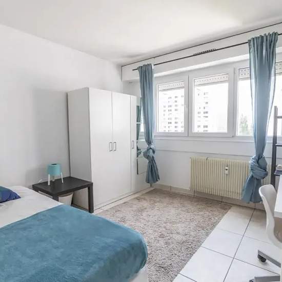 Room of 12m², fully furnished. It has a double bed (140x190) accompanied by a bedside table with lamp and a large mirror at the head of the bed. A work area is included, composed of a desk with chair and lamp. The room also has storage space: a wardrobe with hanging space and a shelf. Located in the Esplanade district, this 100m² flat is ideally situated a few steps from the Parc de la Citadelle and close to all amenities. The flat is located on the 8th floor of a secure building with digicodes and guard and has a lift. The flat is composed ...