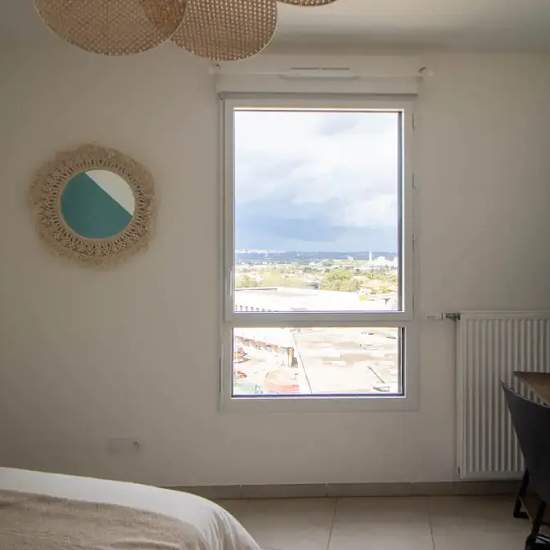 Discover this 10 m² bedroom for rent in Villeurbanne! This fully equipped room is located in a residential building that has just been built, a few minutes from the metro line A and the main shops. Its decoration in blue-gray and blue-green tones delimits the two spaces of this bedroom: a beautiful night space and an office where you can work or study in the best possible way. You will also find a built-in wardrobe to store all your belongings. By choosing coliving, you will no longer have to worry about the additional costs associated with ...