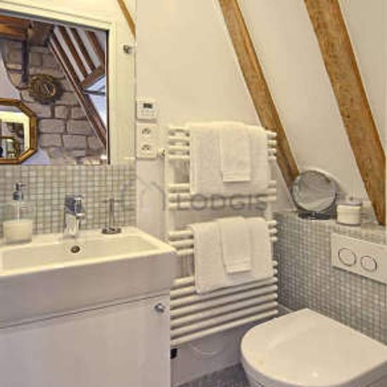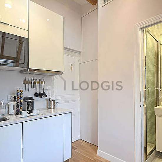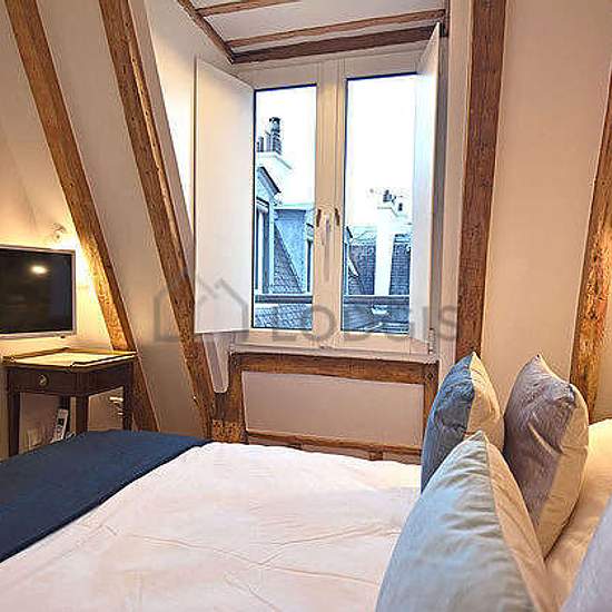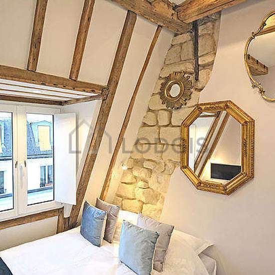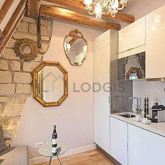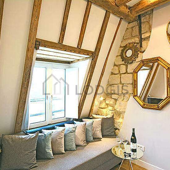 Beautiful little penthouse studio apartment located in the heart of the fashionable and prestigious Marais district on Rue des Rosiers that combines historic beauty with modern comforts (such as elevator and air-conditioning). Uniquely well-equipped for a Parisian apartment, it possesses central air-conditioning, high-speed fiber-optic wifi, full-size Miele washing machine and separate full-size Miele dryer, open kitchenette including cooktop, microwave, refrigerator, and espresso machine. The glass tiled bathroom has a large shower with exc...