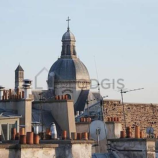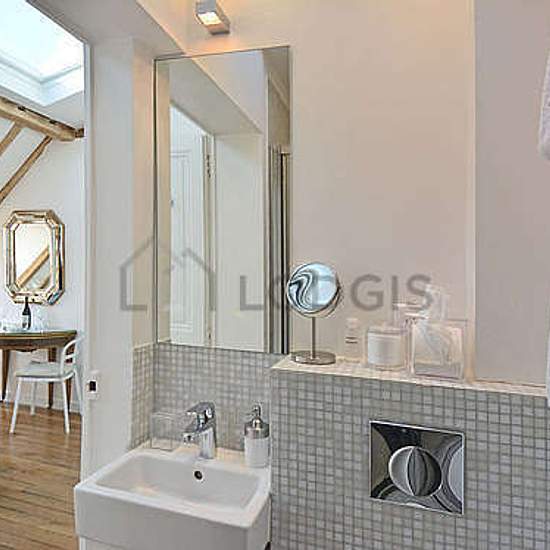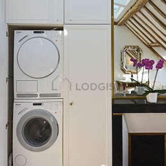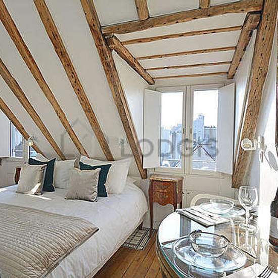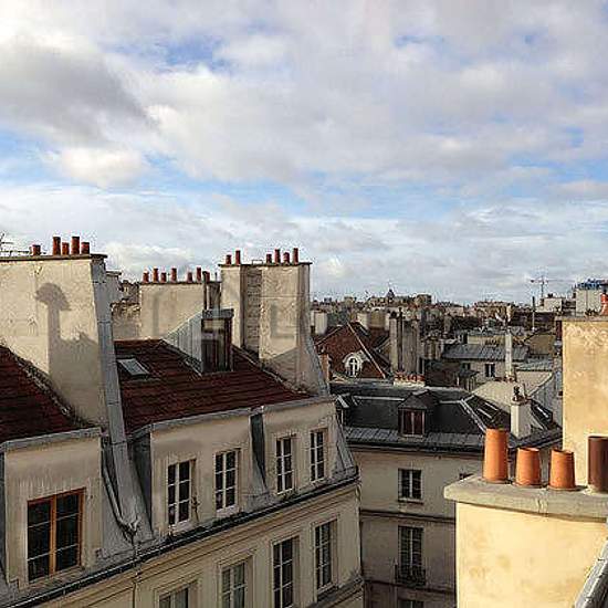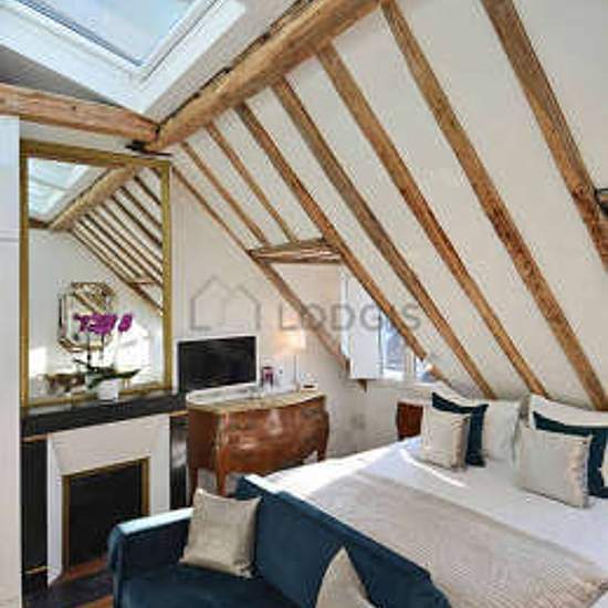 Elegant penthouse studio apartment located in the heart of the fashionable and prestigious Marais district on the beautiful Rue des Rosiers that combines historic beauty with modern comforts (such as elevator and air-conditioning). The apartment has high ceilings, large skylights, and incredible rooftop views of the Parisian skyline including a glimpse of the Eiffel Tower in the distance. Uniquely well-equipped for a Parisian apartment, it possesses central air-conditioning, high-speed fiber-optic wifi, full-size Miele washing machine and se...