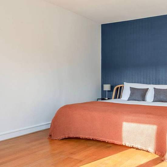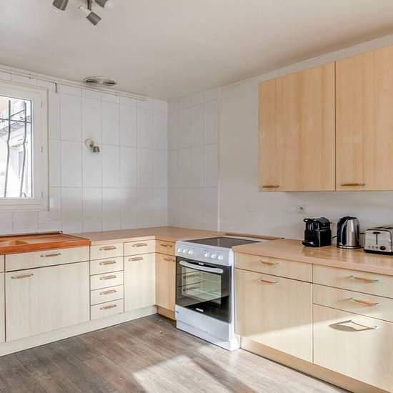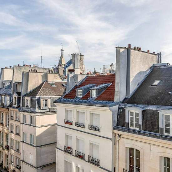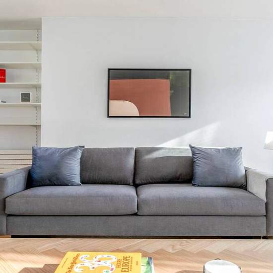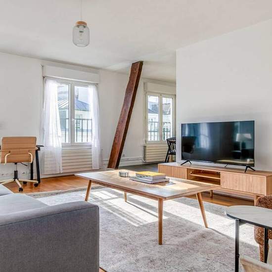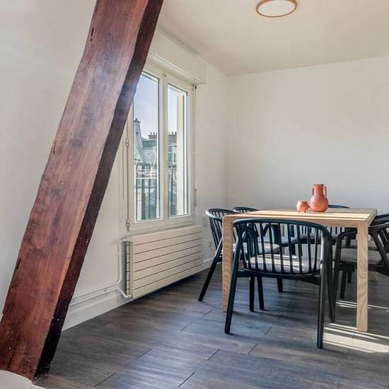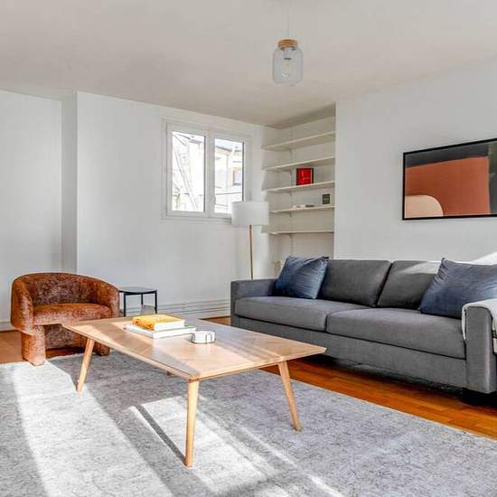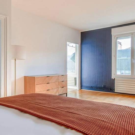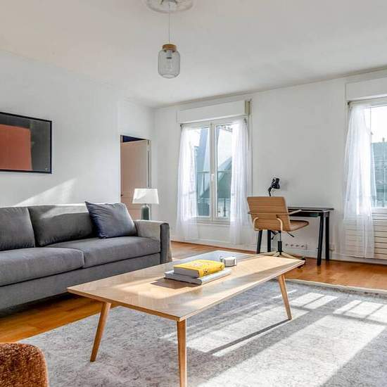 Furnished 1-bedroom apartment for rent on Bd Saint-Michel. The property is on the 5th floor of a building with an elevator. The property includes equipped kitchen, washing machine, dishwasher, and balcony.
