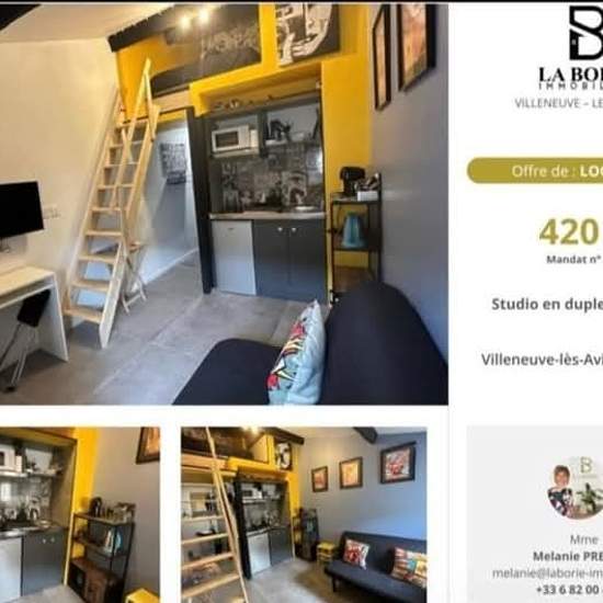 Studio à louer meublé chambre en mezzanine sous les toits – 16 m² – Villeneuve les Avignon Centre-ville Loyer : 430 € / mois (eau comprise) Disponible immédiatement Studio meublé séjour , cuisine équipée et salle de bain. Quartier calme, proche commerces et transports pour plus de photo me contacter