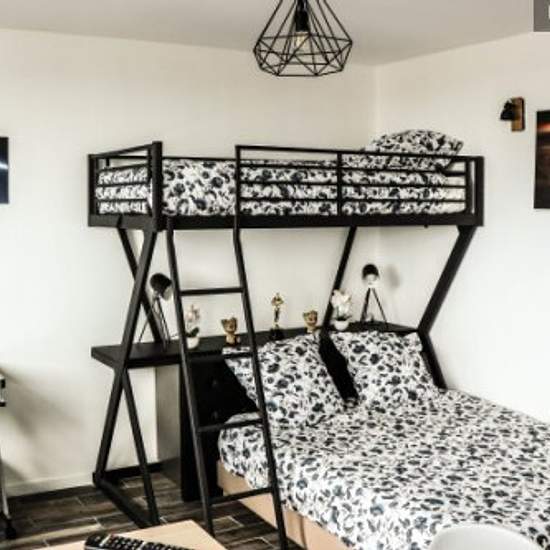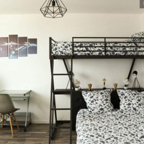 Loue studio tout équipé refait à neuf Vrai lit, matelas de qualité Thème cinéma pour la décoration, en adéquation avec la superbe vue du 22eme étage sur le Grand Paris. Grande cabine de douche avec jets massants Cuisine équipée avec micro-onde four, plaques vitro céramique, frigo smeg, ustensiles de cuisine. 3 couchages Lit de 140x200 et au dessus un lit de 90x200 Espace repas avec table haute et ses 3 chaises Un bureau avec sa chaise pour le télétravail. Télé connectée avec abonnement Netflix inclus. Wi-Fi très haut débit Machine a laver sé...