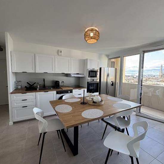 Dans un appartement neuf au 6ème étage avec ascenseur, nouvelle colocation avec jolie vue, très lumineux, traversant avec 2 terrasses. 4 chambres meublées, équipées, disponibles immédiatement, vous en serez les premiers occupants ! Vous partagez un espace commun composé d'une cuisine ouverte entièrement équipée (four, micro-onde, plaque induction, frigo, cafetière nespresso, bouilloire) sur salle à manger, d'un salon. Il y a 2 salle d'eau avec douche à l'italienne. Située dans le nouveau quartier proche de la gare, 5 min à pied pour le TRAM ...