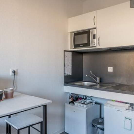 La résidence vous propose ce studio 1 pers avec 1 lit simple fonctionnel et équipé de : Un lit simple (couette et oreillers fournis), salle d'eau avec douche, kitchenette équipée avec vaisselle et petit électroménager inclus (Micro-ondes/ plaque 2 feux/ frigo), espace de travail, Wifi inclus, TV écran plat, chauffage collectif). L'eau et l'électricité sont incluses dans les charges. La résidence propose de nombreux services tels qu'un un local 2 roues, une laverie (avec système de jetons), une salle commune avec une cuisine équipée… La résid...