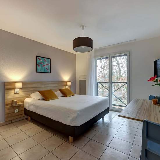 [FR] Ce studio peut accueillir 2 personnes, il se compose d'un lit double ou de deux lits twin, un coin bureau avec une TV écran plat, kitchenette entièrement équipée et une salle d'eau avec douche et WC intégré. La cuisine équipée dispose notamment d'un micro-onde, d'un réfrigérateur, des plaques électriques, d'une cafetière et d'une bouilloire. De la vaisselle et des ustensiles de cuisine sont également fournis. Vous aurez accès à un garage, moyennant un supplément, un parking extérieur, du linge de toilette, du linge de lit ainsi qu'un ac...