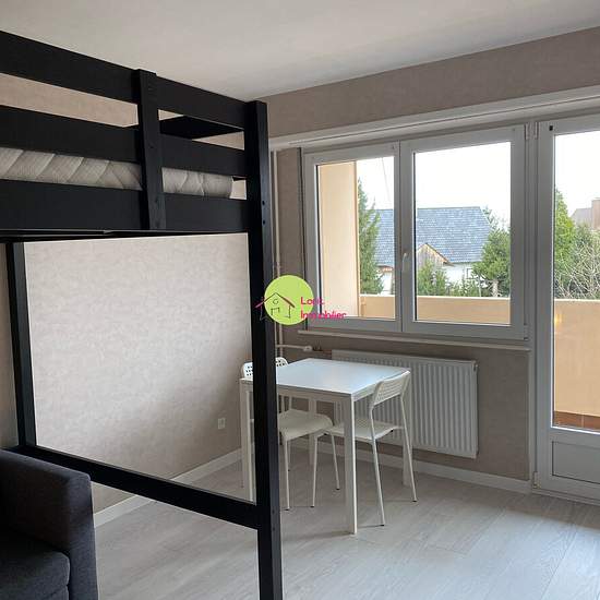 A ERSTEIN dans une rue située au calme - rue des Bâteliers, à proximité de Lidl, Leclerc et du Centre Ville, nous vous proposons cet agréable Studio RENOVÉ et MEUBLÉ de 19,30 m2. Il comprends une pièce de vie de 13,20m2 avec un lit mezzanine 2 places, un canapé, une table basse, un grand placard intégré, une table et chaises. Cette pièce donne sur la cuisine équipée (plaque vitrocéramique, four grill neuf, un frigo neuf, vaisselle, rangements,...) Une belle terrasse de 6,90 m2 saura vous séduire avec son agréable vue dégagée. Une salle de ba...