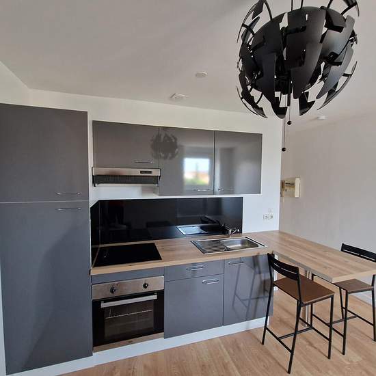 For rent, modern furnished studio of 22.51 m² located in Grezieu la Varenne, on the border of Craponne, close to shops and transport. Completely and tastefully renovated in June 2023, this accommodation includes a parquet entrance hall with fitted closet, a living area with a furnished and equipped kitchenette (hob, oven, extractor hood, fridge/freezer, dishwasher connection, bar table with stools) and a living/bedroom area (TV unit, sofa bed, coffee table, bedside table, lamp). Bathroom with wood-effect tiled floor, equipped with a shower c...