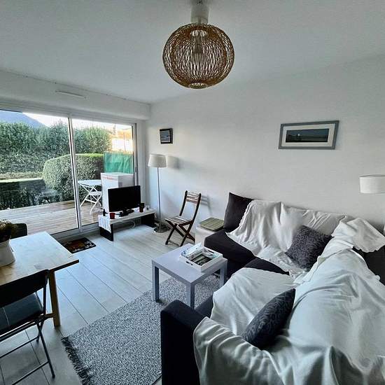 Studio cabine d’environ 27 m2, en rez-de-jardin avec une belle terrasse bois, comprenant une entrée distribuant une cabine (lit superposés 80 x190), une salle de douche avec w-c, une cuisine aménagée et équipée, un séjour (canapé lit de 160 x190). Idéal pour 4 personnes.