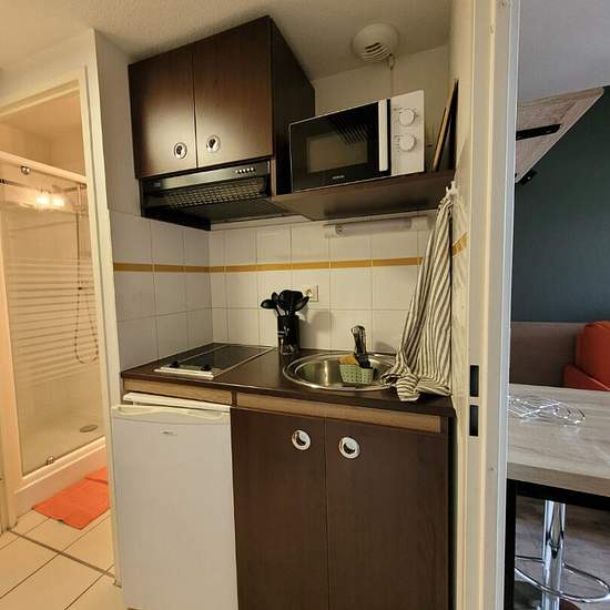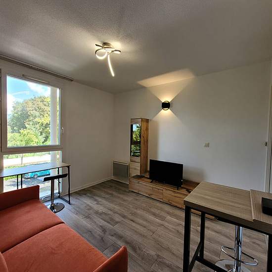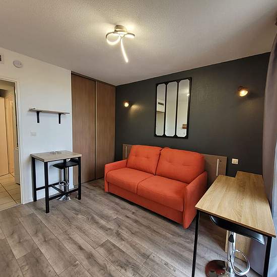 HAUT D'IDRON à l'Est de PAU (10mn du centre-ville et de la Fac, proche Auchan), , en face de tous les commerces et commodités à pieds, Dans une résidence récente sécurisée, en Dernier étage avec ascenseurs, au Calme et sans vis à vis Studio Meublé refait à neuf, 19.60 m² habitables composé d'une kitchenette entièrement équipée (hotte aspirante, four mo, réfrigérateur, plaques de cuisson, lave vaisselle...), donnant sur une pièce de vie aménagée d'un canapé-lit de qualité, bureau, composition meuble + TV , table haute + tabourets, placard... ...