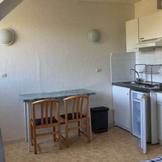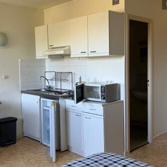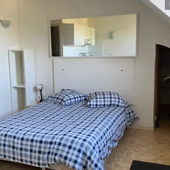 Studio de 20 m², au 1er étage de la résidence. Équipé kitchenette avec micro ondes frigo hotte cafetière et vaisselle. literie à disposition Parking garage à vélo et laverie dans la résidence. Une voiture est nécessaire car peu de bus passe devant la residence
