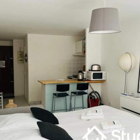 Studio situé à quelques mètres du vieux port en plein centre ville. Pour accéder à l'appartement il faut passer par une petite cours sécurisée par un portail. L'appartement est complètement meublé avec un canapé lit de qualité, une télévision, tout le matériel pour cuisiner, un salon extérieur. La salle de bain (avec Baignoire et machine à laver) et les toilettes sont dans une pièce séparée. Rangements nombreux pour les vetements. L'appartement a également une terrasse qui donne sur une cours intérieure. L'appartement est équipé d'une box in...