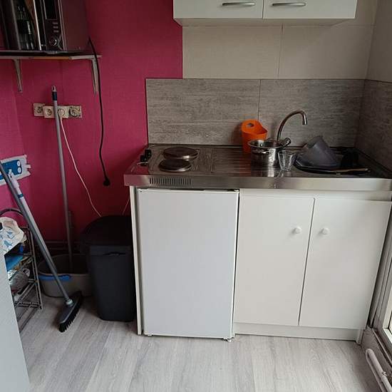 Studio in Lambersart in a quiet, secure residence. Beautiful, very bright studio at the rear of the building, quiet, comprising a pleasant living area with an equipped kitchenette and a bathroom with a bathtub; 3rd floor with elevator. Résidence Jardin du Bourg, Lambersart — unfurnished apartment.