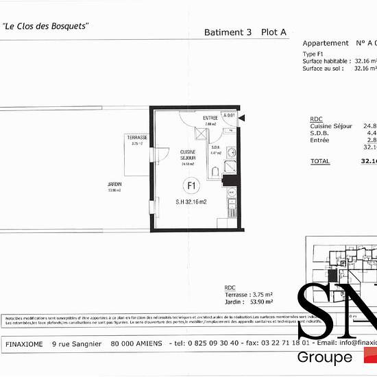 SNG IMMOBILIER // RESIDENCE LE CLOS DES BOSQUETS DISPONIBLE LE 16/01/2026 Contactez Madame PRENANT Patricia au 06x66x23x15x15 ou par mail : EMAIL pour visiter cet appartement T1 meublé de 33.23 m² situé au RDC dans résidence. Comprenant une entrée, une pièce principale, un coin cuisine, une salle d'eau avec WC. Une terrasse de 3.75m² et un jardin de 53.90m². Vous disposez aussi d'une place de Parking. Honoraires de 365,53 € TTC à la charge du locataire comprenant 99,69 € TTC pour l'état des lieux. Loyer de base 385.00 €/mois. Provision sur c...