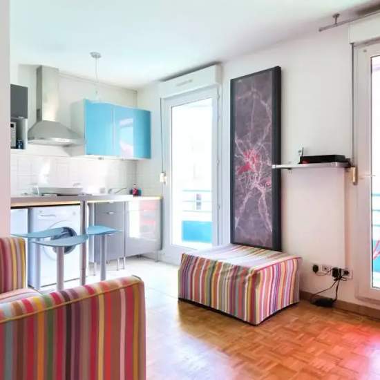 This bright studio apartment is available for rent in Lyon's 7th Arrondissement. There is an equipped kitchen with a washing machine, stove, and microwave, as well as a breakfast bar. The bedroom area has a double bed and the bathroom has a toilet, sink, and shower. The apartment is close to the River Rhone where you can take a stroll through the park on a summer's day. There is a pharmacy nearby too, and a bike sharing station. Details Property type: apartment Floor area: 26 m² Floor: 3rd Elevator: yes Number of bathrooms: 1 Maximum occupan...