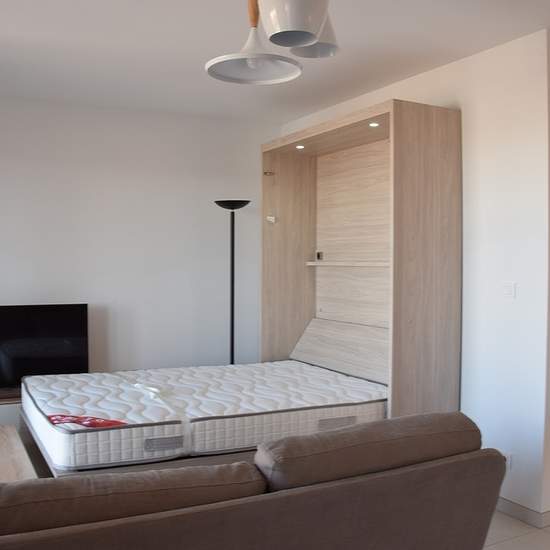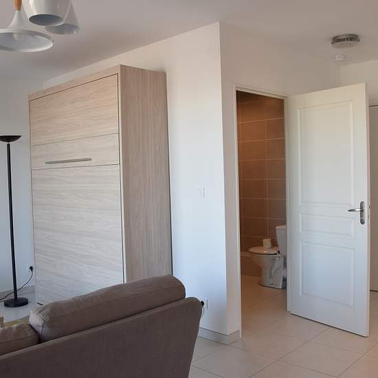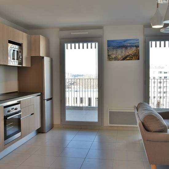 Beautiful furnished studio in a new residence with a large terrace. Very bright. Spacious with a real double bed that folds away, making the living space completely available. Supermarket and bus at the foot of the building. Parking in the residence available upon request. BUS #49 Flammarion Isoard Tram T2 Longchamp