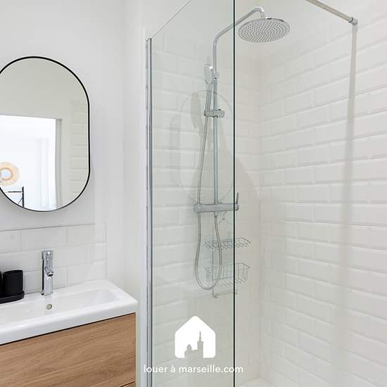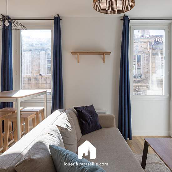 Bright T2 apartment, south-facing, completely renovated in October 2023. Located on the 3rd floor without elevator of a typical Marseille three-window building on a very quiet street, in the Vertus neighborhood. It comprises: A large main room featuring a decorative marble fireplace and benefiting from three large PVC double-glazed windows. It is furnished with a sofa, a coffee table, a TV, a TV stand, and other equipment. The open kitchen is fully equipped, including an induction hob, an oven, a microwave, a washing machine, a refrigerator ...