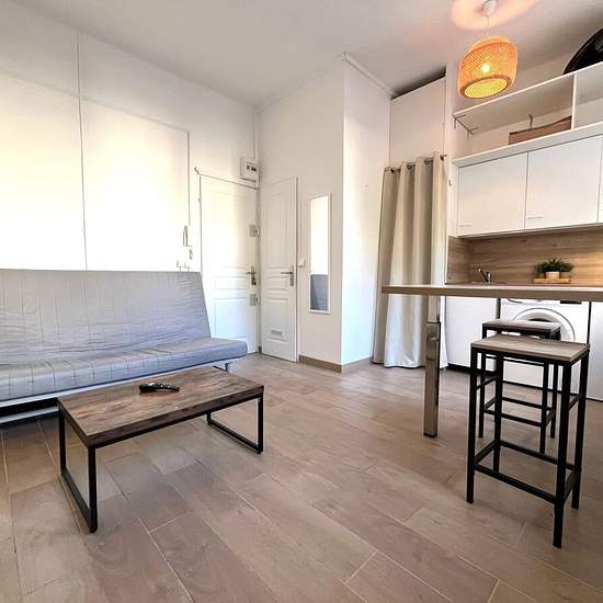 Type 1 apartment — Vauban district, 6th arrondissement of Marseille. Very nice fully furnished and renovated studio of 16.70 m2 on the ground floor. It comprises a living area with an open, equipped and fitted kitchen of 14.84 m2 and a shower room with toilet. Amenities nearby. Manual roller shutters, PVC double glazing, intercom. Contact: Caroline Jouvet