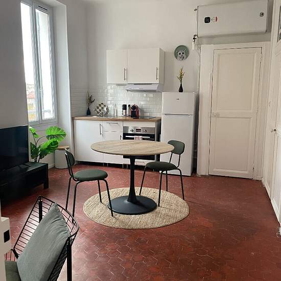 Rue Chaix quartier prisé Saint Victor très beau studio meublé entièrement rénové et joliment décoré d'environ 27m² au 1er étage , lumineux ,au calme , proche toutes commodités comprenant une pièce principale avec cuisine aménagée et équipée 1 salle d'eau avec wc une terrasse climatisation réversible, Internet LIBRE DE SUITE Assurance garantie loyers impayés revenus minimum 2340 euros